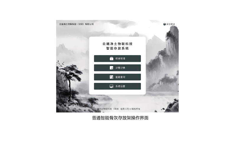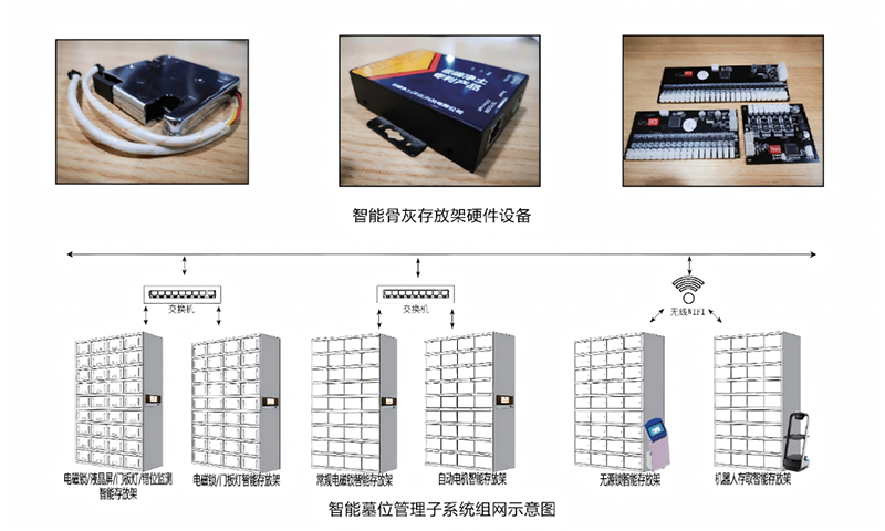 本系统由存放架设备、电控锁、控制设备、架体机及配套的业务软件及控制软件组成。采用先进的星型并联组网模式,业务信息管理与柜体控制分离部署:可实现断网开门操作。智能存放架功能涵盖:刷卡/扫码/指纹开门,柜体门板亮灯/屏显文字,架体内物品检测,架体机可实现信息录入、数据查询、现场祭奠操作。